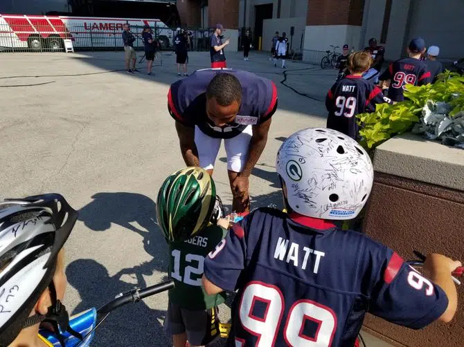 Watt grew up in Wisconsin and fans young and old clamored for a photo or autograph before and after practice and he obliged as many as he could in a fun return to his home state.