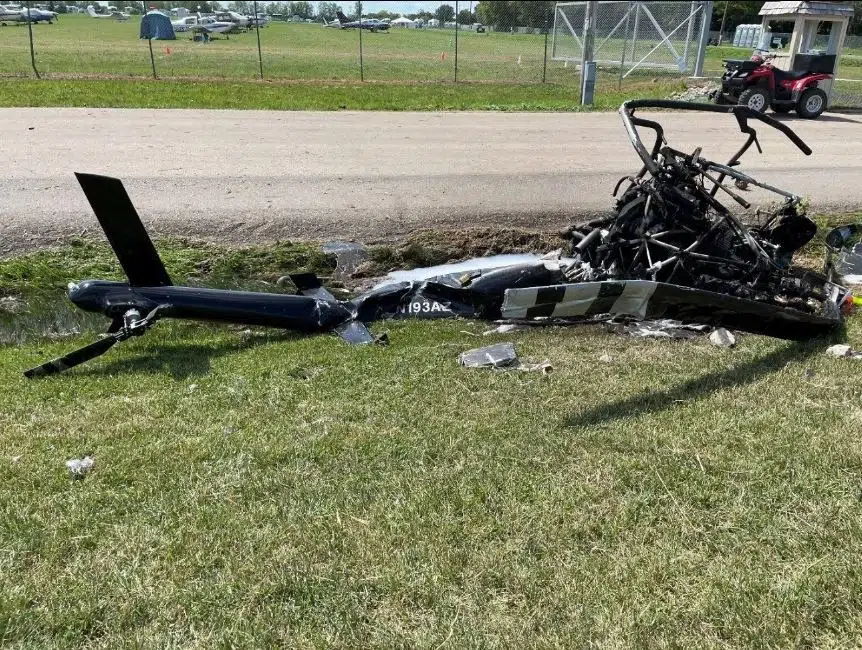 A helicopter is destroyed after a midair collision at EAA AirVenture in Oshkosh July 29, 2023. PC: Fox 11 Online