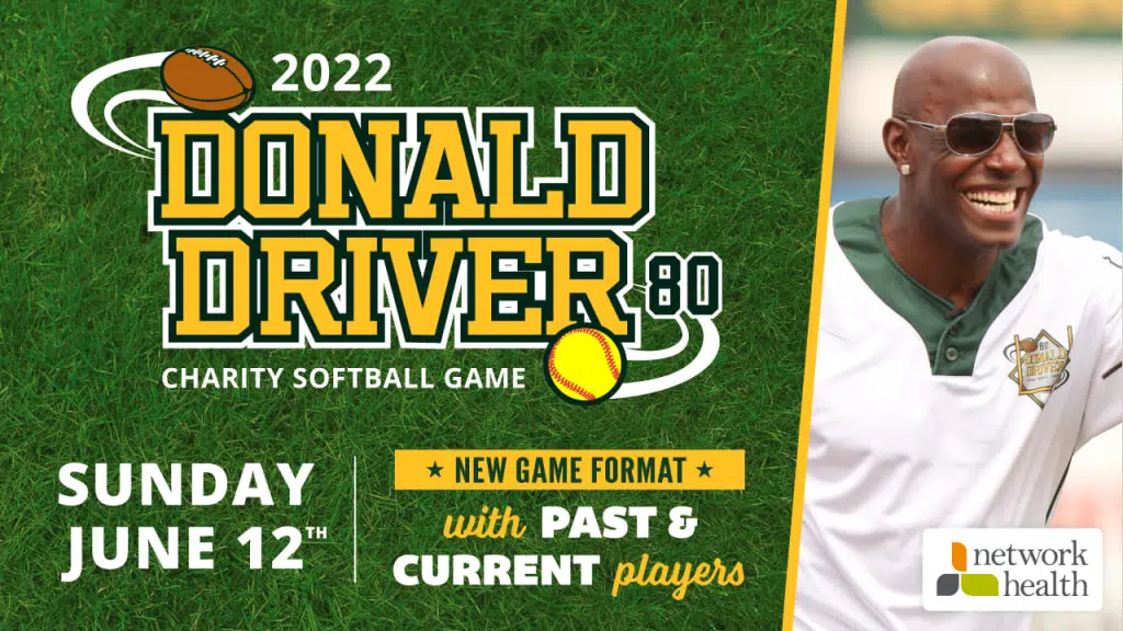 Green Bay Super Bowl Champions and current stars will combine to bring fans the Donald Driver Charity Softball Game at Neuroscience Group Field at Fox Cities Stadium on Sunday, June 12, 2022 at 1:00pm. Donald Driver, James Jones, and AJ Dillon are the confirmed hosts of the event to raise money for the Donald Driver Foundation and additional local and player charities. The game is sponsored by Network Health.